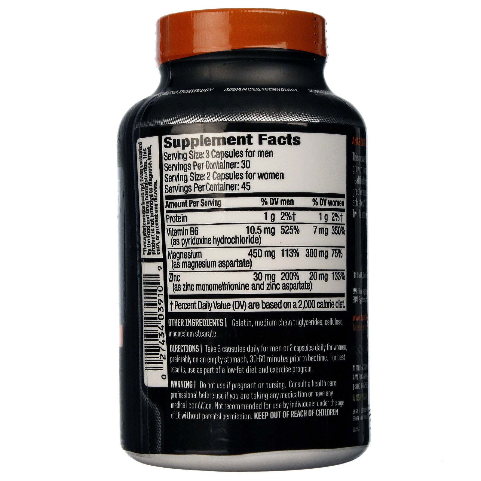 Notes: Supplement facts listed are for a male serving (3 capsules). A female serving (2 capsules) contains 1 g Protein, 7 mg Vitamin B6 (as Pryidoxine Hydrochloride), 300 mg Magnesium (as Magnesium Aspartate) and 20 mg Zinc (as Zinc Monoethionine and Zinc Asparate).